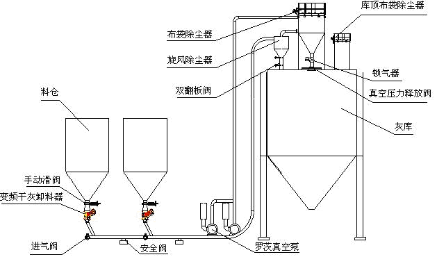 负压气力输送系统 在气力输送网络中,风机工作时,风机的进口段管道形成负压,出口段管道形成正压,物料被风机从进口段管道吸入,并在进口段管道中随着带有一定负压速度的气流输送达到指定地方,这种方法就是负压气力输送。 一、负压输送系统 气力输送是利用气流来运送物料,它的工作原理是将物料吸入管内的空气中,构成悬浮的混合物,通过管道输送到目的地,然后将物料分离出来。它主要用来输送散粒物料,由于气流输送有效率高,密封性好,受环境影响小,设备结构简单紧凑,布置灵活,占地小,造价低,自动化程度高等优越性能,所以随着粉体工业的不断发展,这一新的输送方式也被逐渐推广应用于粉体物料生产上,并显示出它的优越性。 吸送式气力输送装置的原理与吸尘器相同,适用于把分散在各处的粉粒集中起来,工作压力一般可达-0.6大气压,输送距离一般为0-100m,混合比可达10,输送量因管径而异 二、负压输送优点 1、由于输送管道中的压力小于大气压,所以完全消除了散发粉尘的可能,而粉料生产中的粉尘问题是较为难解决的问题之一,所以选用吸送式气流输送可防止粉尘飞扬,大大改善可见的卫生条件; 2、设备简单,又易于操作管理,而0~100m的输送距离,又适合生产的需要,所以应用较为理想,在输送过程中,进料口不必封闭,可边连续加料边输送,另外由于物料在大气压以下的气流中输送,水分易蒸发,这对粉体物料的质量提高有一定的好处,同时对物料有一定的降温和冷却作用。 3、操作灵活方便,可进行多点吸料; 4、设备结构紧凑,占地面积少,布置灵活; 5、设备自动化程度较高,可连续生产,效率高; 6、减轻工人劳动强度,节约人工; 7、负压输送不扬灰,防尘效果好,有利于环境保护。 三、负压输送工作原理: 利用罗茨鼓风机(真空泵)产生负压,通过文氏进料器,将物料与一定量的空气混合后经过输料管送到料气分离器内;物料从料气分离器中分离后落下,由锁气卸料器均匀卸料进入料仓,与物料分离后的清洁的空气从分离器上部经过排风管,从罗茨真空泵出风口排至大气. |
