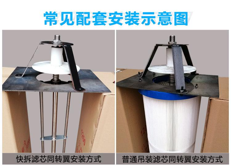 旋转翼滤筒除尘器是一种旋转脉冲喷吹滤筒除尘器,所述滤筒除尘器包括用隔板分隔的过滤室和净气室两个气室,其特征在于所述旋转脉冲喷吹的部件包括喷吹导管、圆形滤筒、滤筒内的三角形滤筒框架以及安装在滤筒中心位置的喷吹管,所述喷吹管与所述喷吹导管连接,所述滤筒与水平方向呈一倾斜角度安装在所述过滤室内部,所述喷吹导管在所述净气室内一直延伸至穿出净气室,最终与脉冲气包连接;所述滤筒框架与所述喷吹管、所述喷吹管与所述喷吹导管的端部连接处采用喷吹安装组件连接。