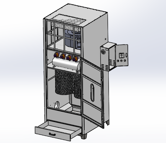 吸嘴吸气清灰的旋转滤筒除尘器由壳体、滤筒和清灰吸嘴3部分组成,滤筒一端封闭,一端敞开,中心轴及配置的轴承保证滤筒运转平稳,敞开一面与隔板形成动态密封。首先用金属结构件制成滤筒的圆筒型骨架,在圆筒表面依次蒙上金属网、纤维滤料和不锈钢丝网最外层不锈钢丝网的作用是使纤维滤料均匀受力,避免清灰时因频繁变形而疲劳损坏。