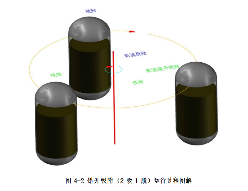 凝系统错开脱附再生,运行时 2 台并联用于吸附一台轮换用于脱附; 脱附好的新塔重新用于吸附运行,脱附前通过管路阀门切换实现吸 附塔不同的运行状态。图解过程见图 4-2,图中各吸附塔在不同的运行时段按箭头顺序轮换角色。