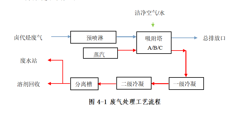 吸附饱和后,采用蒸汽对吸附剂进行脱附再生,脱附后的有机蒸汽经过冷凝分离后,有机溶剂和废水进行单独收集。经过蒸汽高温脱附后的吸附塔再用冷风或水吹扫降温,以备于重新吸附使用,不凝气体排入吸附系统前端重新进行吸附。吸附罐冷却采用压缩空气或风机吹扫,不凝气体排入吸附系统前端重新进行吸附。