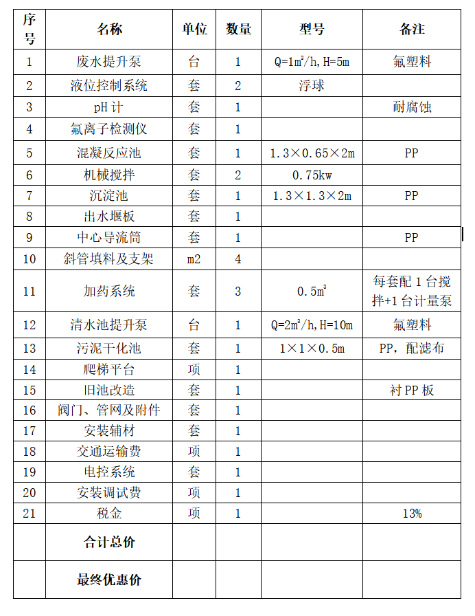 设计处理水量1t/h(氟离子≯100mg/L)。